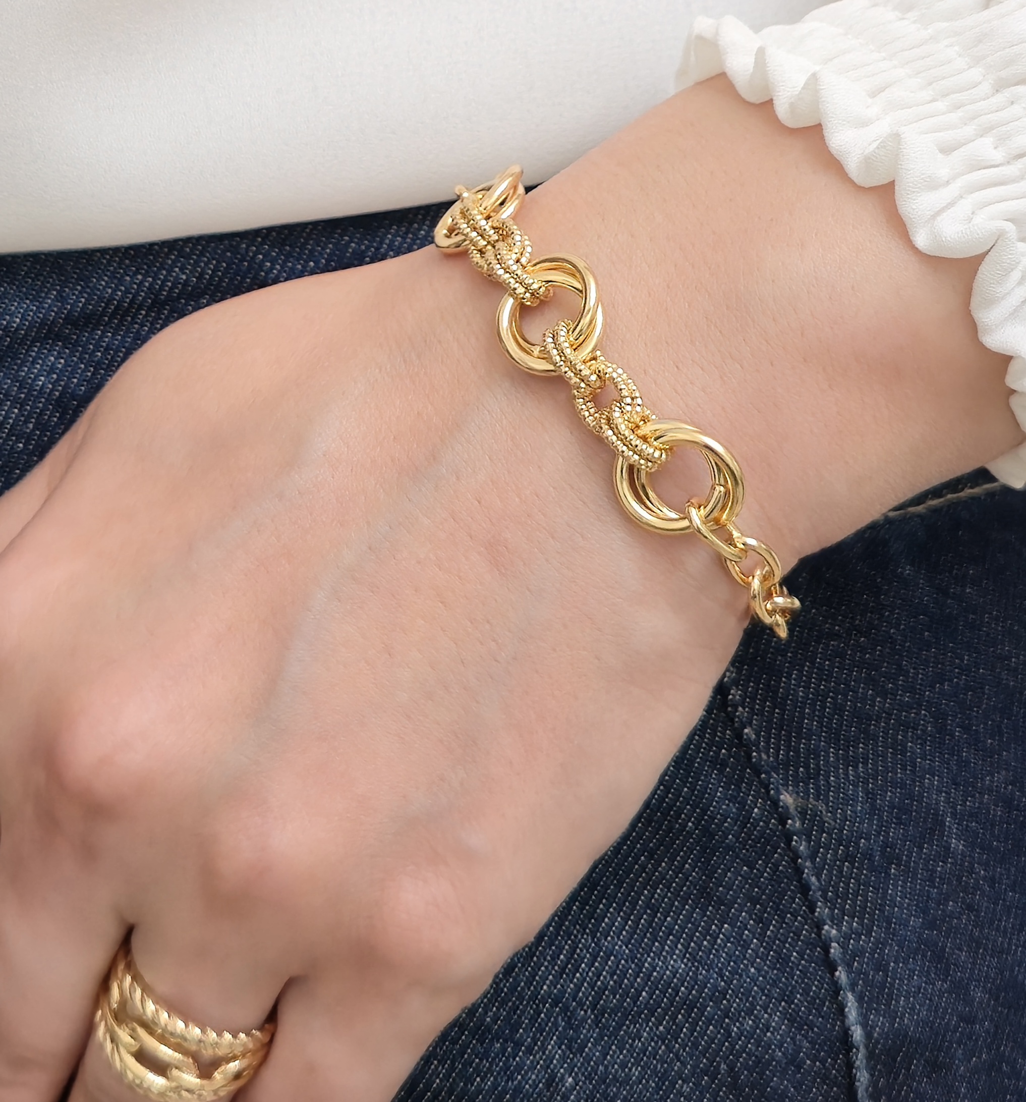 دستبند دخترانه شیک ژوپینگ با طرح رولو دوبل (حلقه دوتایی)، کاری خاص و زیبا برای خوشسلیقهها. بدون نگین اما بافت و تراش زیبای آن، زیبایی این دستبند را دوچندان کرده است. همین حالا سفارش دهید تا جعبه جواهرات خود را کامل کنید! ساخته شده از آلیاژ مس با آبکاری طلا، کاملا مشابه طلا، ضدحساسیت، اما با قیمت بسیار مناسب تا با کمترین هزینه در هر جمع و مهمانی بیشتر از پیش بدرخشید و خاص بمانید. فروشگاه بدلیجات زنانه و دخترانه الین گالری همراه همیشگی شما در انتخاب یک استایل ناب و خاص! سایز دستبند: طول ۱۷٫۵ بعلاوه ۳٫۵ سانتیمتر و قطر تقریبی ۷ میلیمتر. (برای اطلاع از نحوه نگهداری و ثبات رنگ محصول، صفحه راهنمای نگهداری بدلیجات را مطالعه فرمایید).