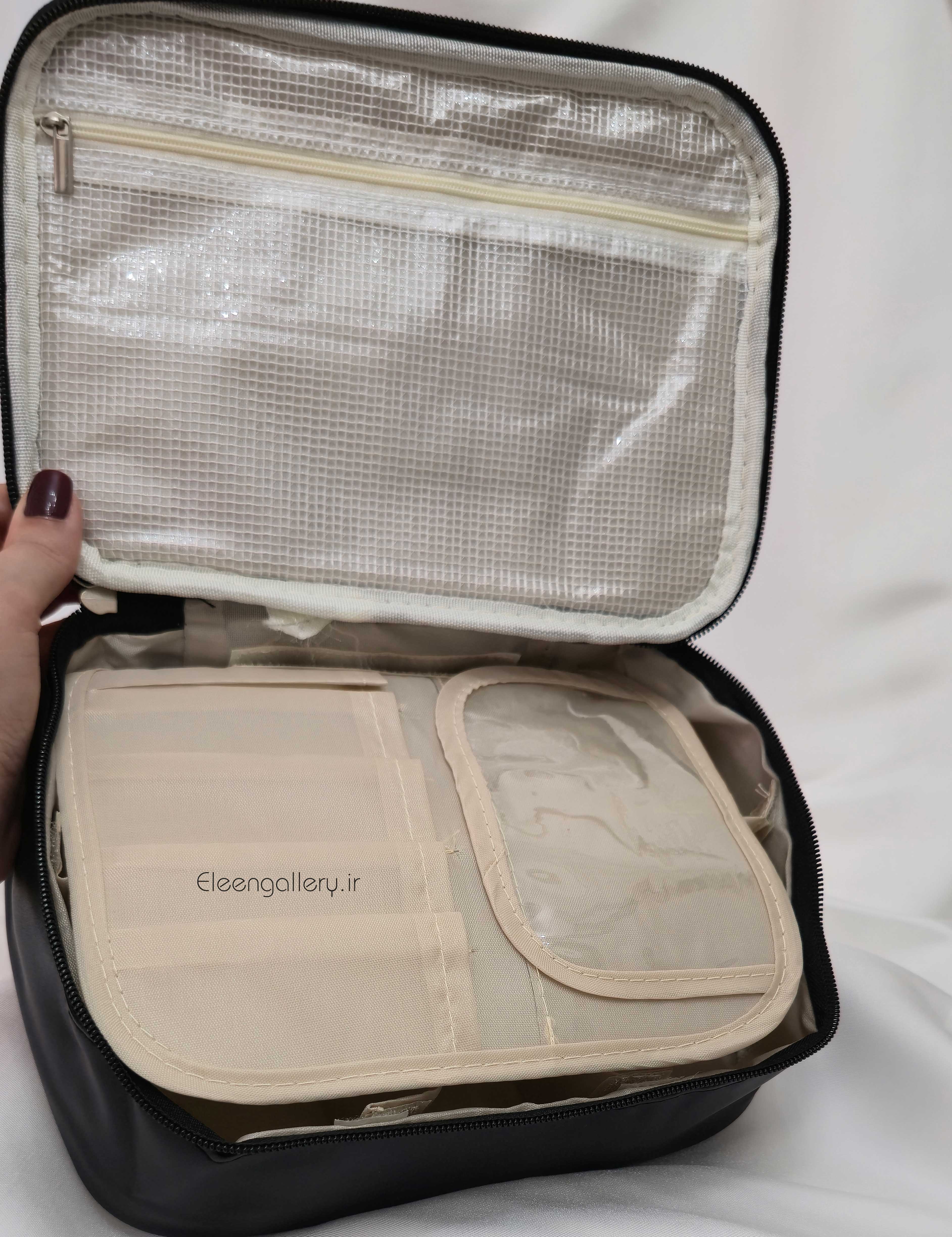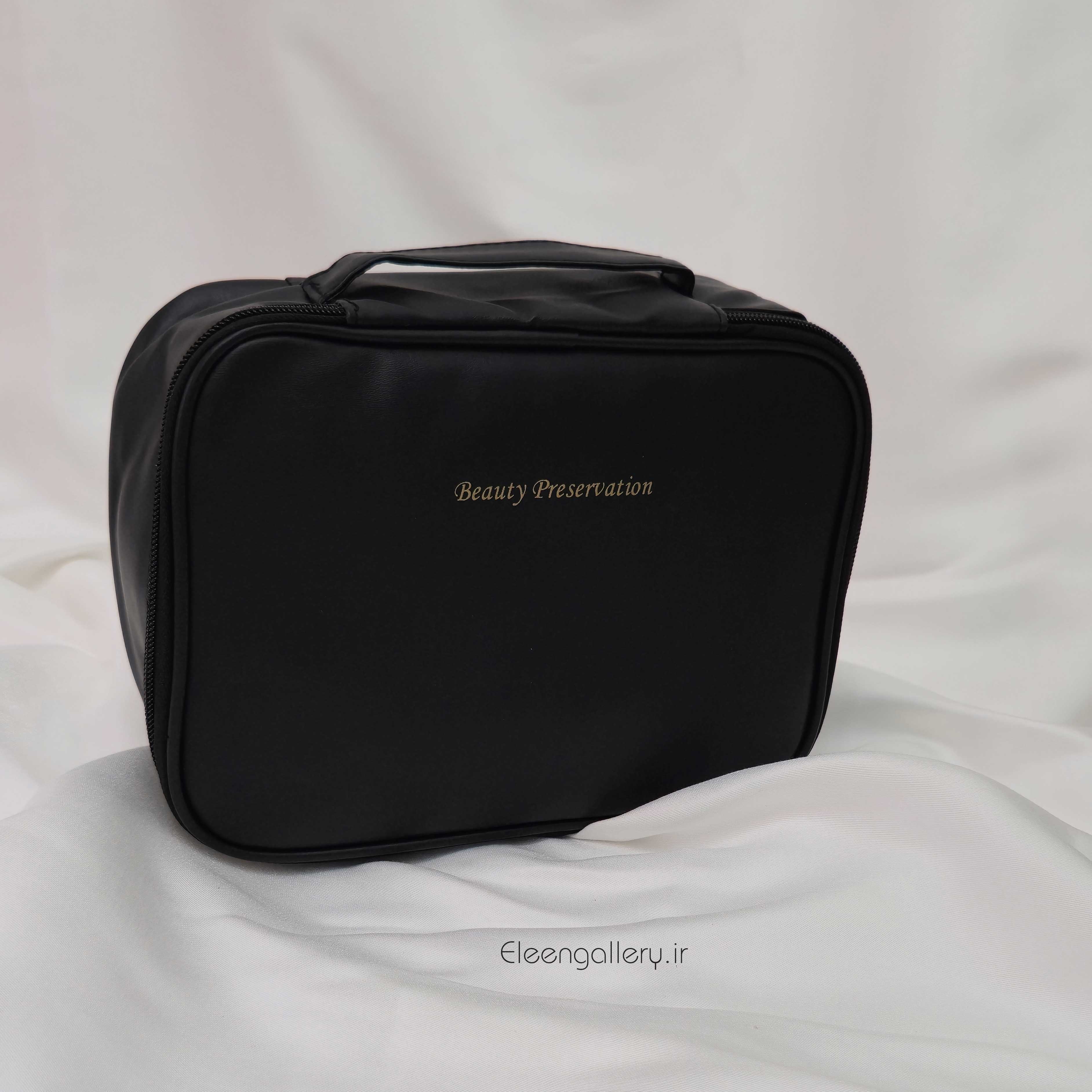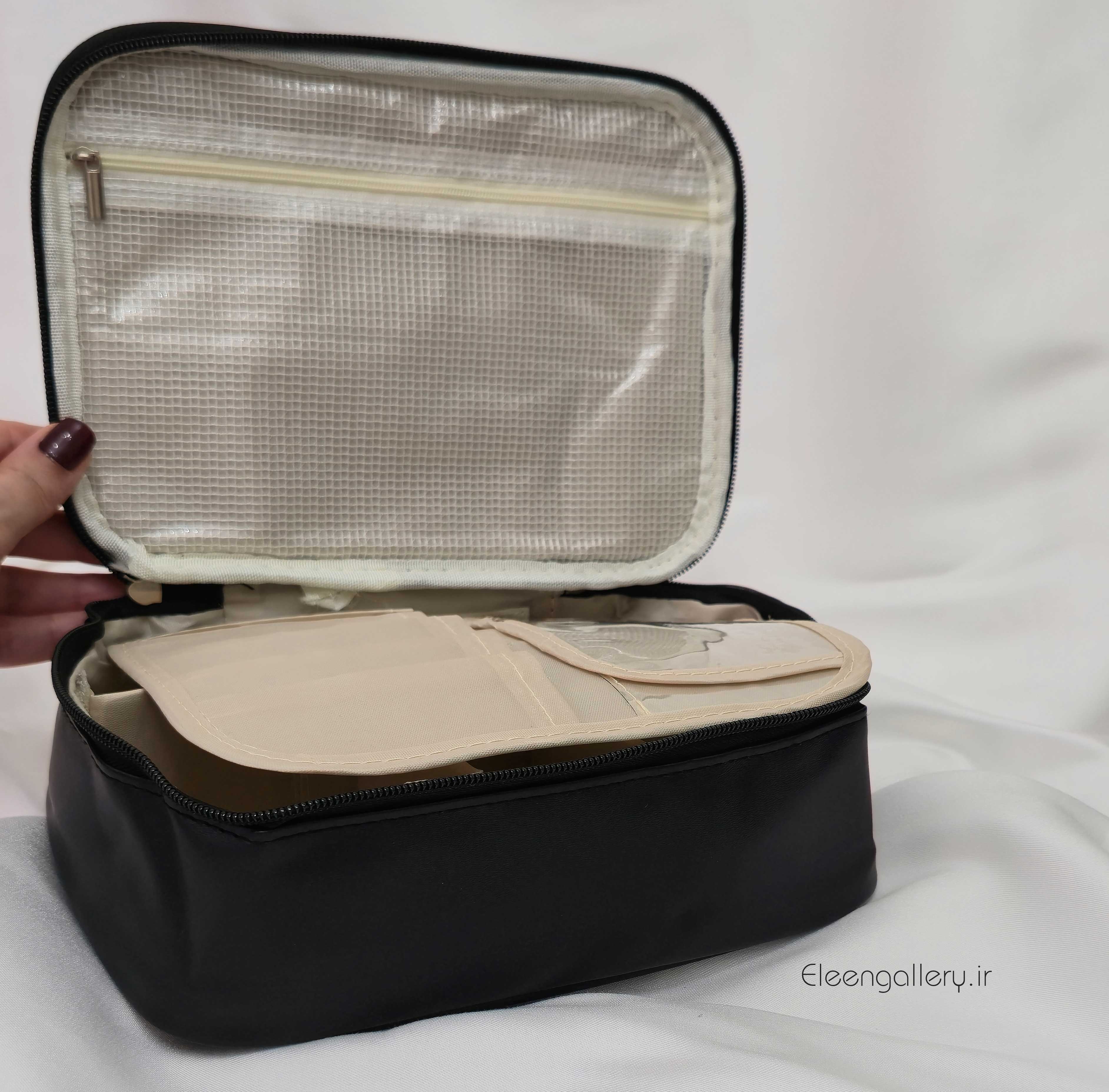 کیف لوازم آرایش طرح مستطیل برنگ مشکی، ساخته شده از چرم مصنوعی، مدل زیپی، مناسب برای نظم دادن به لوازم آرایش ضروری شما در سفر، بهمراه زیپ و نظم دهنده داخلی برای انواع براش و لوازم آرایش متنوع. کاری شیک با قیمت مناسب. سایز: طول ۲۴، عرض ۱۸ و ارتفاع ۸.